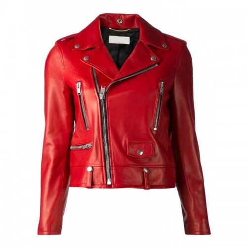 This beautiful ladies red classic biker leather jacket is Made of top quality lamb leather. This ladies red classic biker leather jacket has four out side pocket's and two in side pockets . YKK zippered front and cuff's. A very nice red classic leather jacket that look's great