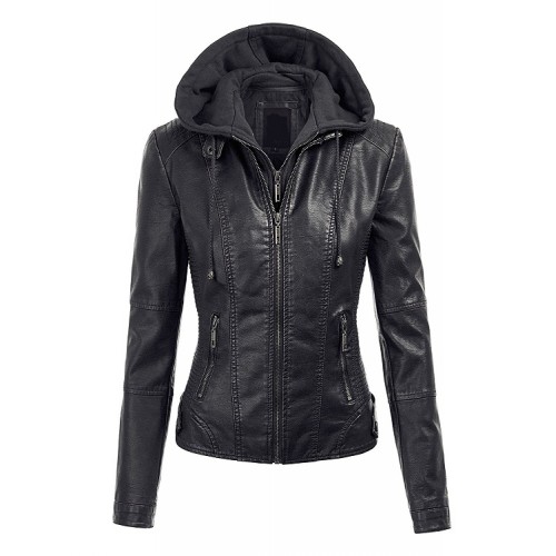 Ladies Black Zipped Style Lamb Leather Jacket With Open Hooded Jacket. 100% Genuine lambskin leather.