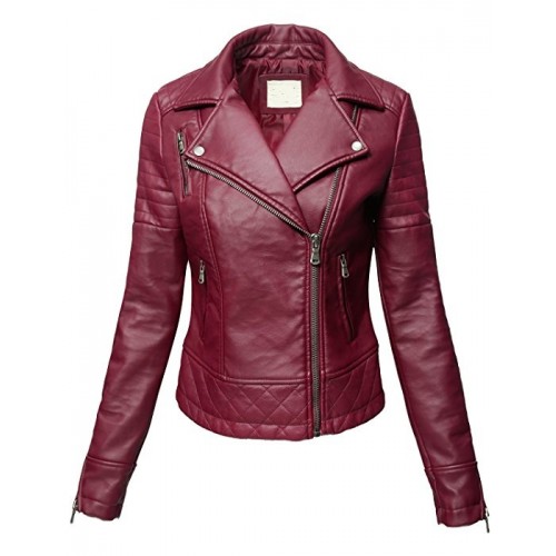 Ladies Red Burgundy Laminated Shiny Biker Style Leather Jacket.