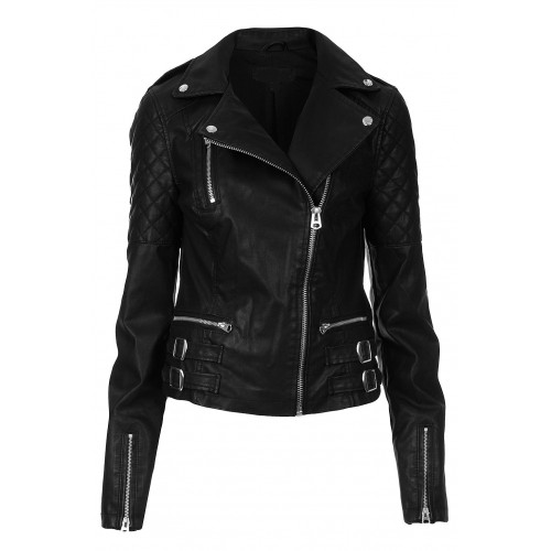 Women Black Motorbike Long Sleeves Leather Jacket